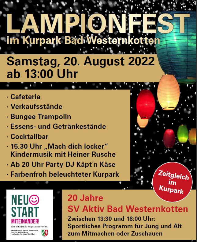 Ab 13 Uhr öffnet das Lampionfest seine Tore. Es erwarten Sie eine Cocktailbar, verschiedene Verkaufsstände sowie Essens- und Getränkestände. Für Unterhaltung von Klein und Groß ist gesorgt. Am Abend unterhält Sie ein DJ auf der Bühne.
